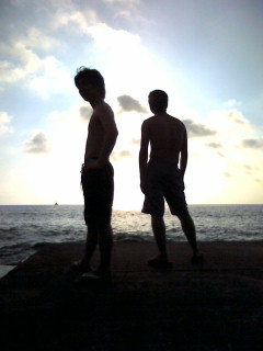 今日は観光でもしてやろうとグァム(白浜)の周辺を探索してると、どうやら自殺の名所なんて場所があるらしい… これは行かねば!って事で車を走らせるとそこは断崖絶壁で、火曜サスペンス劇場のラストシーンに出てきそうな場所でした…(画像1) 思わず何か白状してしまいそうな気持ちに(^^;) その後、気になる寺があったので行こうと思ったけど、リニューアル中とのこと… そこの名前は「金閣寺」 和歌山に金閣寺?? おかしいやんな? また次の機会にでも確かめに行きます。 それから温泉でも入って帰ろうか?って感じやったんですけど、海が呼んでる気がして急遽また海水浴に変更(笑) 某映画の名シーンばりに(画像2)楽しみました! 帰りは大渋滞に巻き込まれたけど…サンキュー白浜、グッバイ和歌山ぁ~(≧▽≦)無事怪我も無く帰ってまいりました♪ A氏運転ご苦労様! いやいやそれにしても楽しかったっす! 息抜き出来たし、明日からまた頑張れそうや♪ あとは反町ッスのドラマ「ビーチボーイズ」でもみて残り少ない夏を楽しみますかねぇ~★ あっ、今夏の旅でのベストショットを…(画像3)八尾のDef Techがお送りしました(笑)
